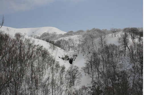 林道からは右でも左でも(二口経由)行けそうだが、先行者のトレースを追ってシールを付け林道を長峰方向に歩く。林道が長峰に向かって大きく右にカーブするあたりからスギ林の中を滑降すると二分〜大平間の道路に出た。