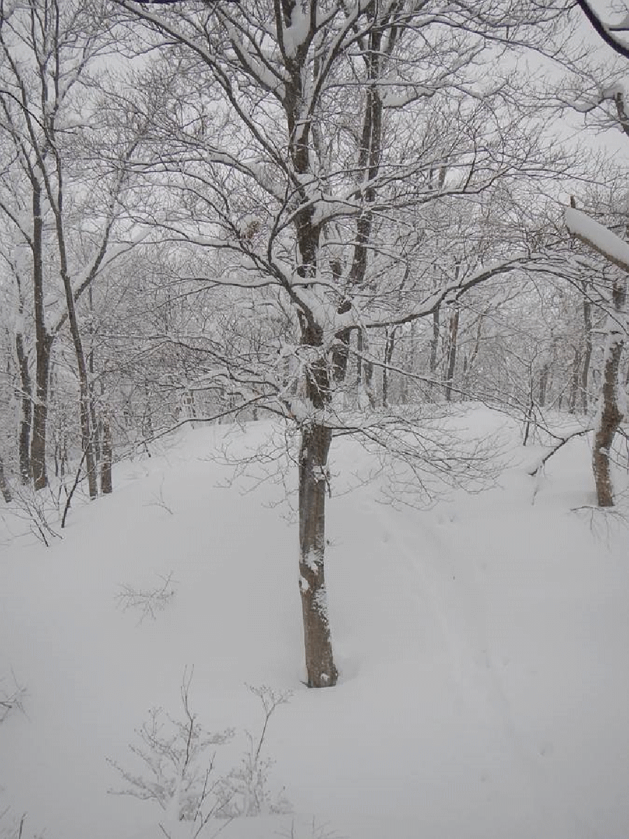 高城からゆるやかに下り、袴腰山頂への尾根道となる。山頂直下の急登では雪は深くなり、膝上のラッセルとなった。