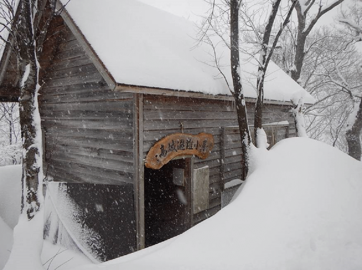 お寺を過ぎ、車道から登山道に入る。ここ数日の新雪が2、30センチメートルほどになっていた。雪景色の木立が美しい。夏道通りに登り、高城城址の避難小屋に着いた。