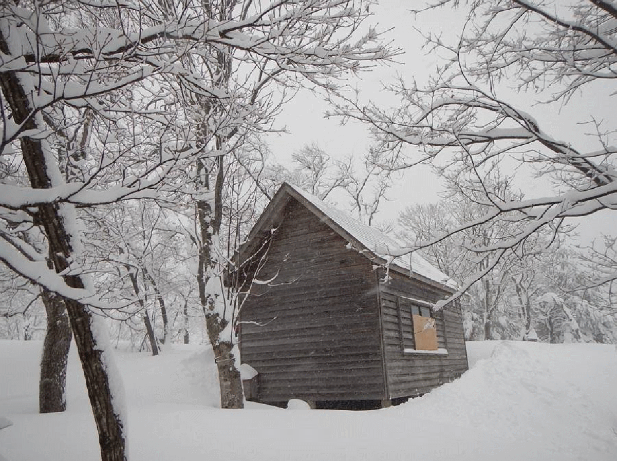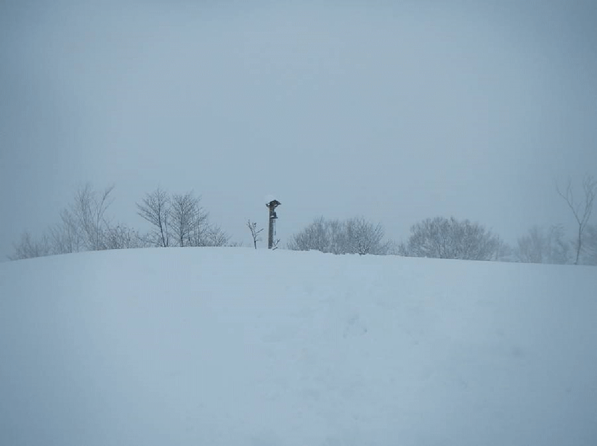 袴腰山頂は雪が降り注ぐ(?)といった感じとなった。一面の銀世界ではなく、水色の世界だ。何も遮るものがない山頂。晴れれば素晴らしい展望が得られるのだろう。