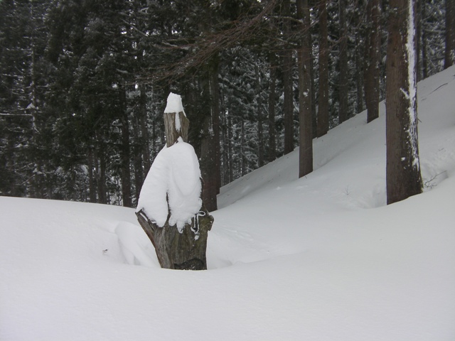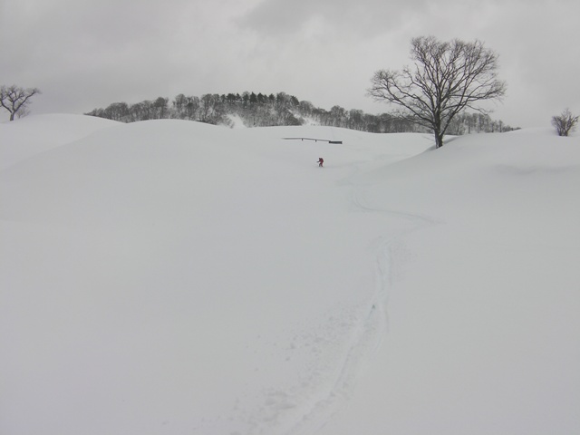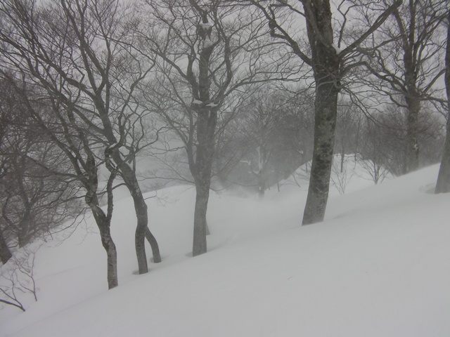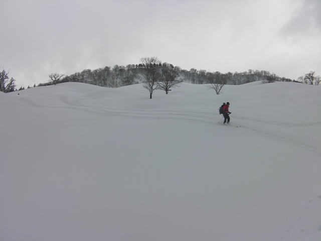 樽口峠付近に来ると,ようやく雪が少しだけ良くなる.何となく粉雪の気分がするが,締まった重い雪だ.