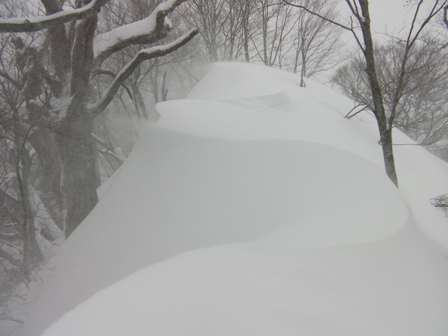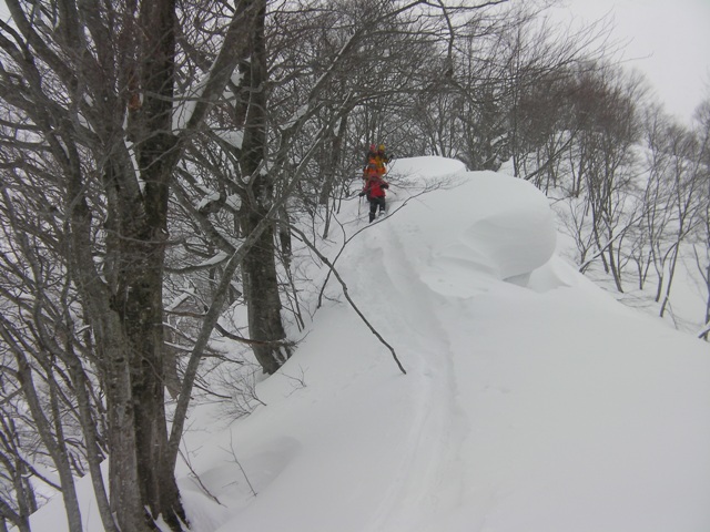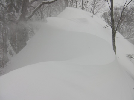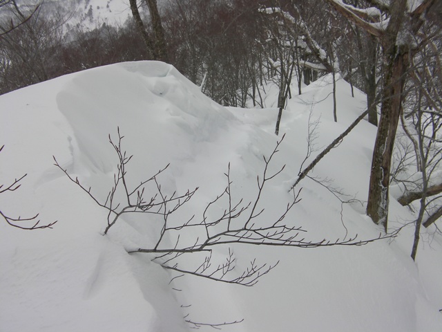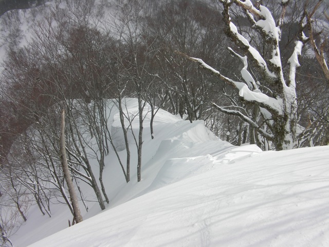 705mピークへ続く尾根も地形図で見るよりもやせているところがある.足元の雪が雪崩れる.自分のスキーのカットで深さ20cm,幅5m,走路20mほどの雪崩を起こしてしまった.気を付けよう.