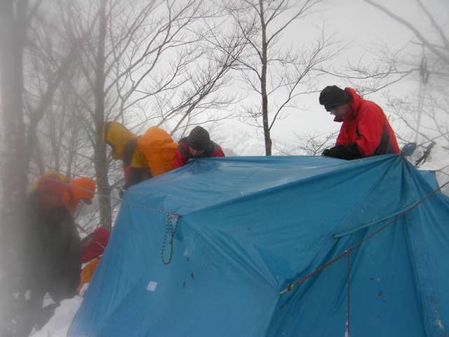 時間は早いので,入念に昼の憩いの会場を設営する.フライの中に入れば,もう外の風雪とはお別れし,ぬくぬくである.
