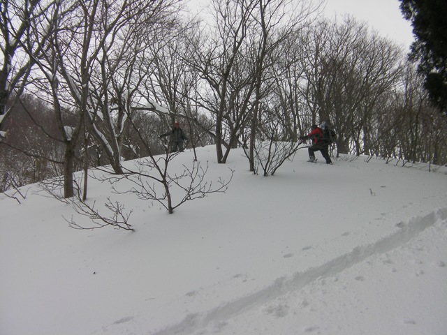 後は,樽口峠まで快適な灌木斜面が続く.杉林を抜けると樽口峠だ.会長と隊員約1名は,登り足りなかったようで,樽口峠から勢い余って反対側の斜面に取り付いている.