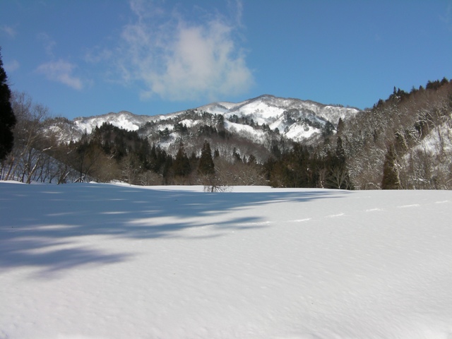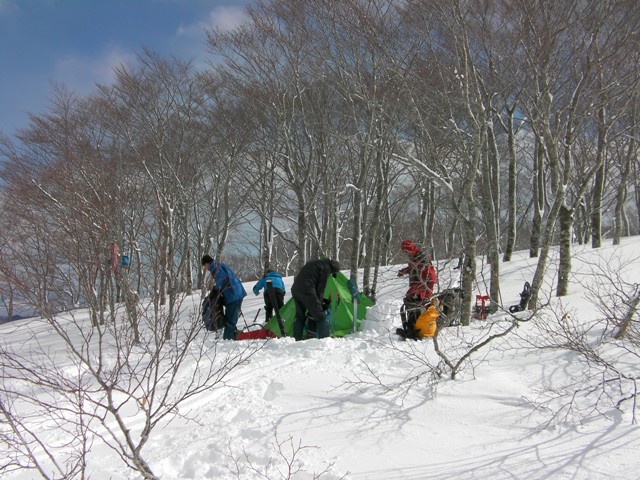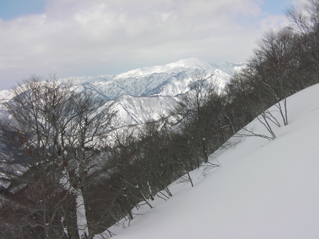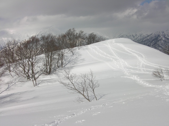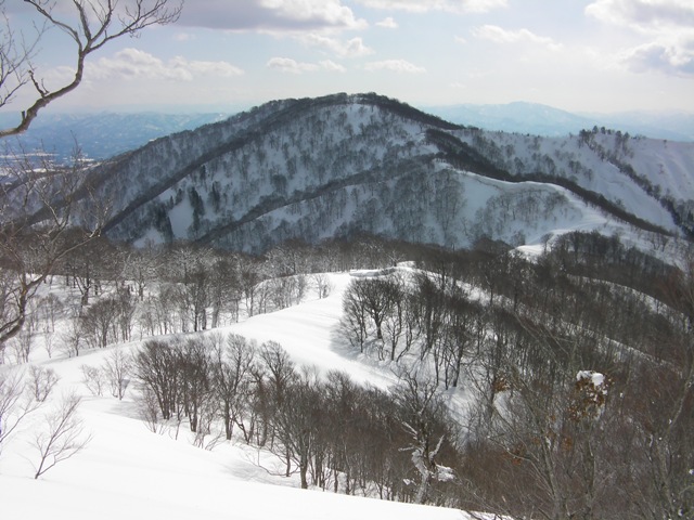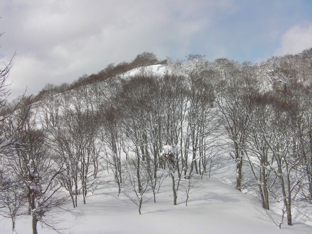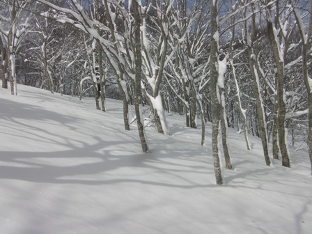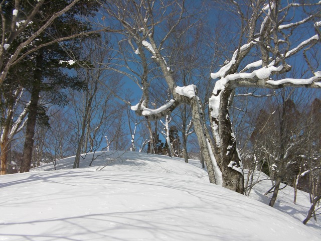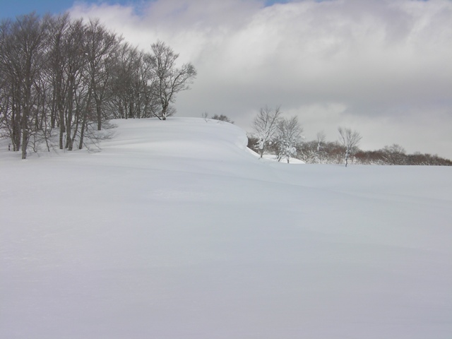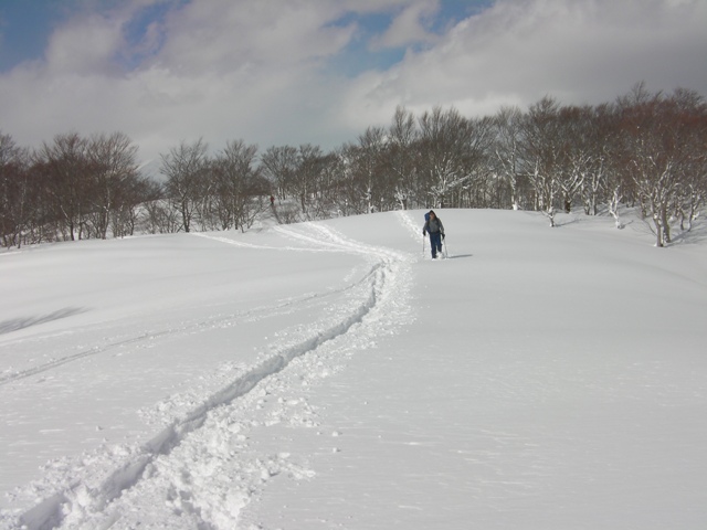 予想外に天気も良く,今シーズン初めての青空の下での登山である.申し分ありません.雪の状態も思いのほか良く,滑りも十分に楽しめた.何より山頂台地が素晴らしい.ブナの林を歩いたり,滑ったり最高である.そして人工物が目に入らないのがいい.
