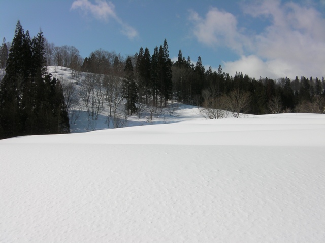 表面が凍り始めた手強いスピードの出る雪となった尾根から,標高530m付近で杉林に滑りこみ田んぼに出ると弥生である.