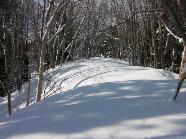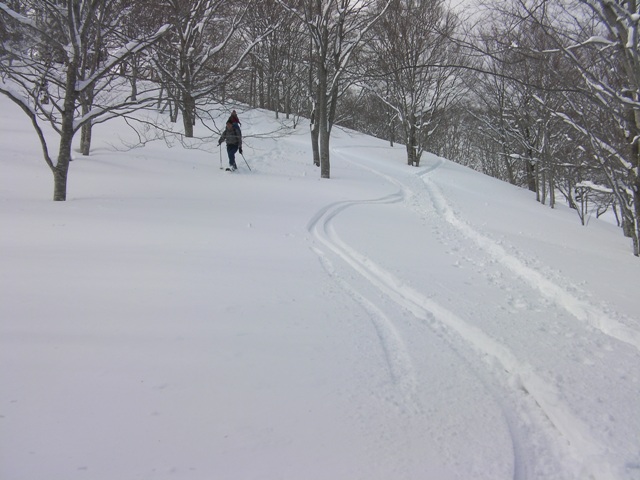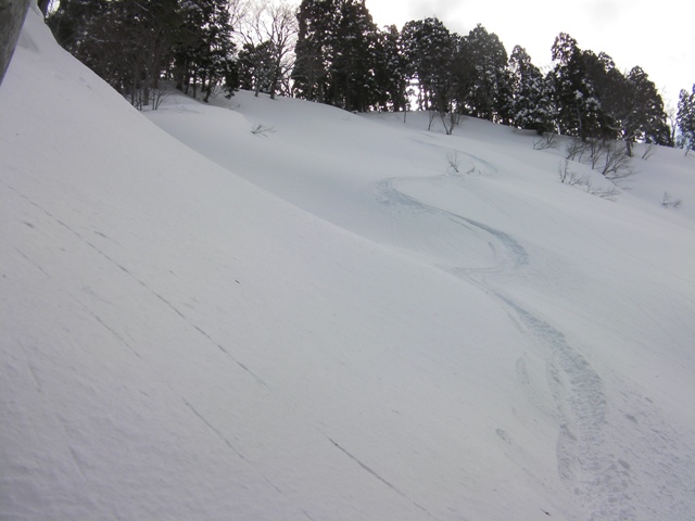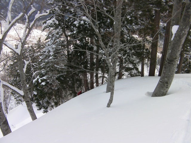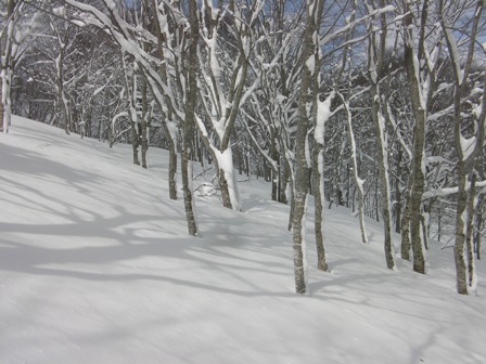 急斜面は標高920m付近で終わり,859m標高点までは杉や五葉松の間を滑る.ここは雪が粉っぽくて以外にも滑りを楽しめる.