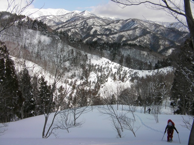 標高600m付近で尾根を乗り換えると切り開き状の斜面が広がる.振り返ると遠くに白い飯豊本山が見える.
