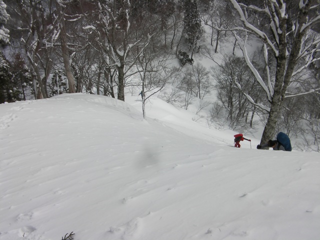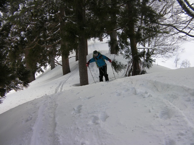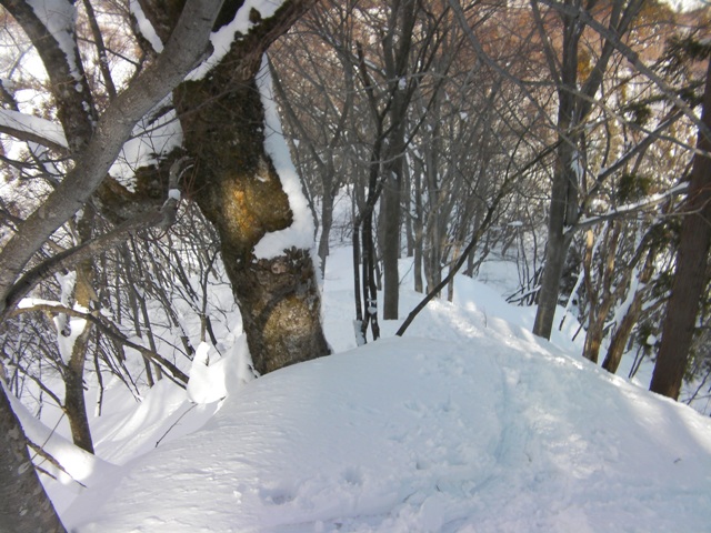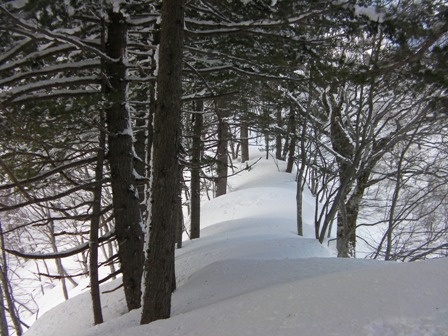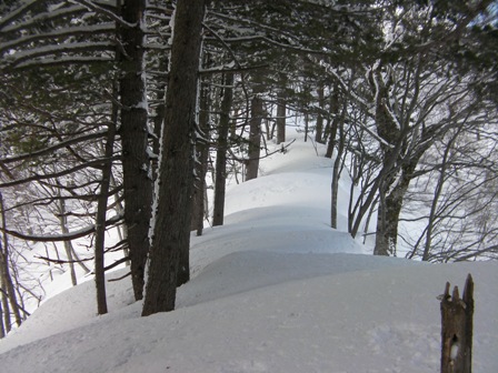 ここを過ぎると,いよいよ問題の急で細い尾根である.その尾根の両側は木の無い急斜面が広がっている.木が無いということは雪崩が良く起きる斜面ということである.そのため,風によって段差ができた細くて急な尾根なりに直登する.過去には最後の杉の木のところが急なうえに雪が深くて,仕方なくスキーを外して両手両足をもがくように使って何とか這い上がったこともある.