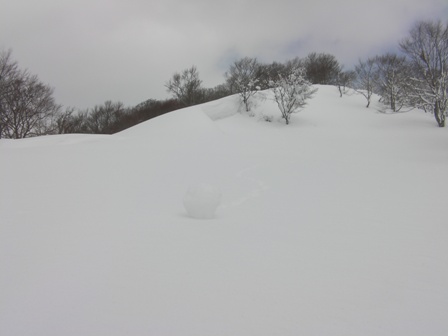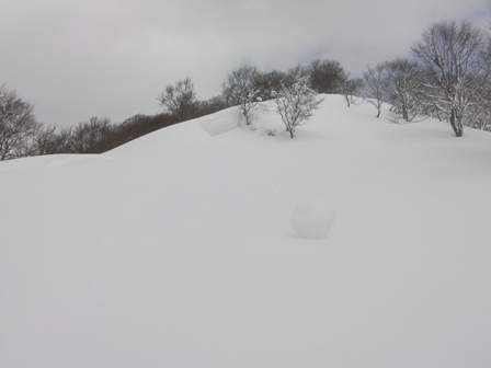 次の標高約1135mのピーク(仮に「第1ピーク」としよう.)へ続く尾根は,木がほとんどなく,会津側に雪庇ができている.その雪庇から転げてきた直径10cmくらいのスノーボールが真っ白な斜面にポツンとあって思わず和む.