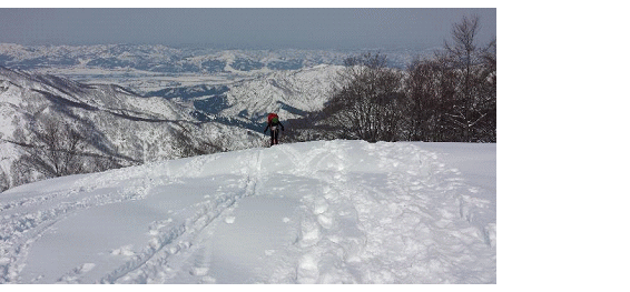 順調に高度をかせげるものの、スキーでは少々つらいところもある。快調に飛ばすスノーシューのA会長は、後続からは見えなくなった。天気はまだ快晴で西に延びるこの尾根にも陽がさしてくる。