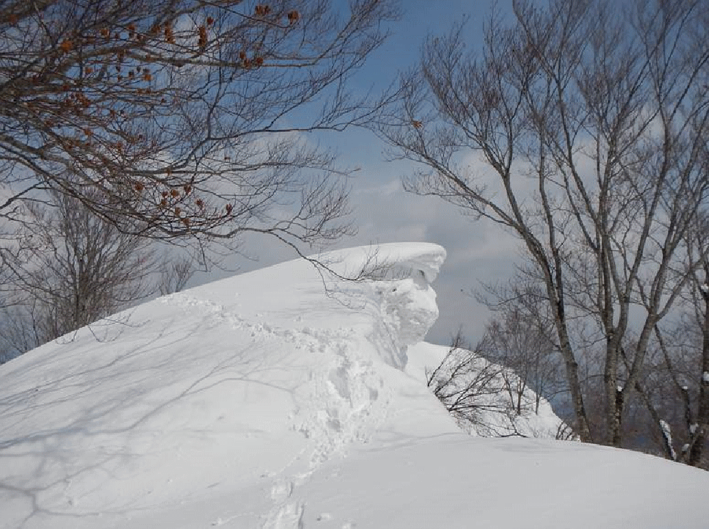 雪庇を乗っ越すと大花山山頂だった。何もさえぎるものがなく、ポッコリとした雪の台地となっている。2月に樽口集落から登ったさいに付けた目印テープが揺れていた。樽口集落への尾根は真っ直ぐに下りており、集落もよく見える。こちらの尾根へも雪が張り出している。