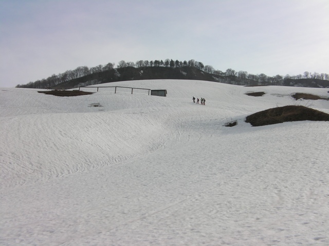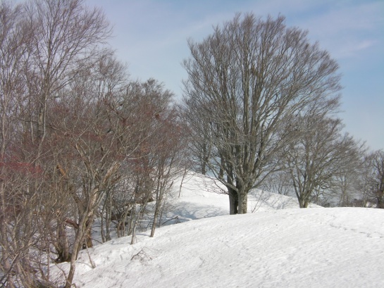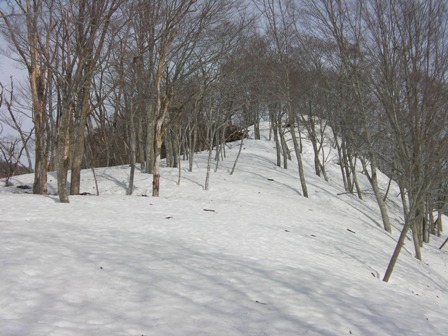 見晴らしは利かないが一番高いところに至る.地図を見ると三角点のある山頂はもっと北側である.大きくうねった尾根の先に見える雪庇のあたりが山頂のようだ.スキーは楽しめそうもないが,ここは山頂を踏まねばならない.何しろ3回目の突撃なのである.