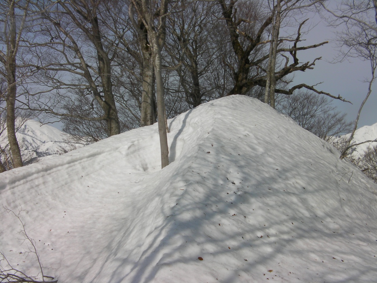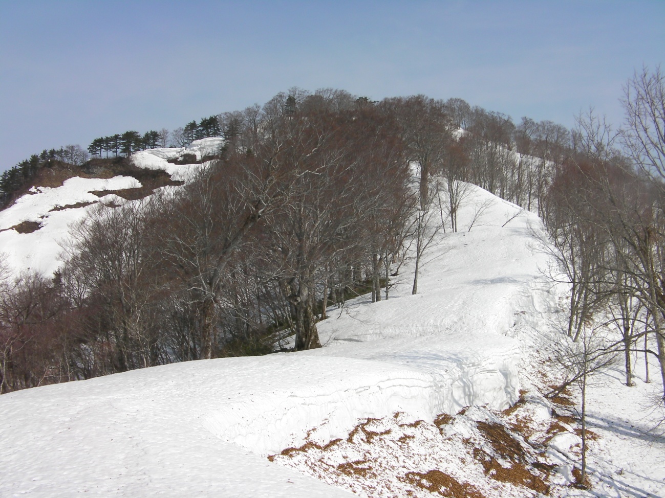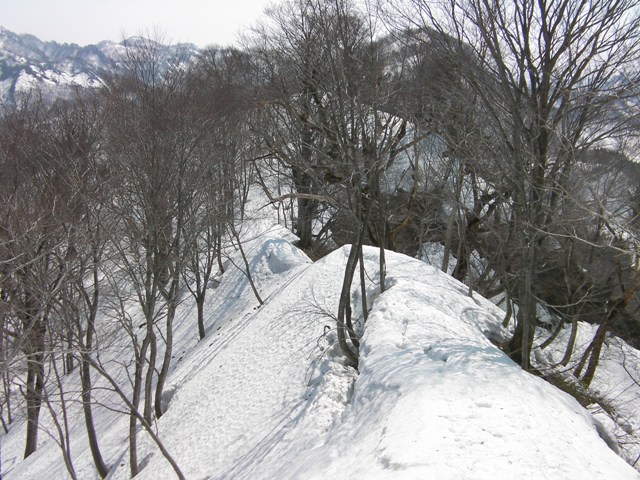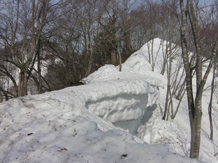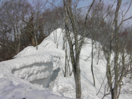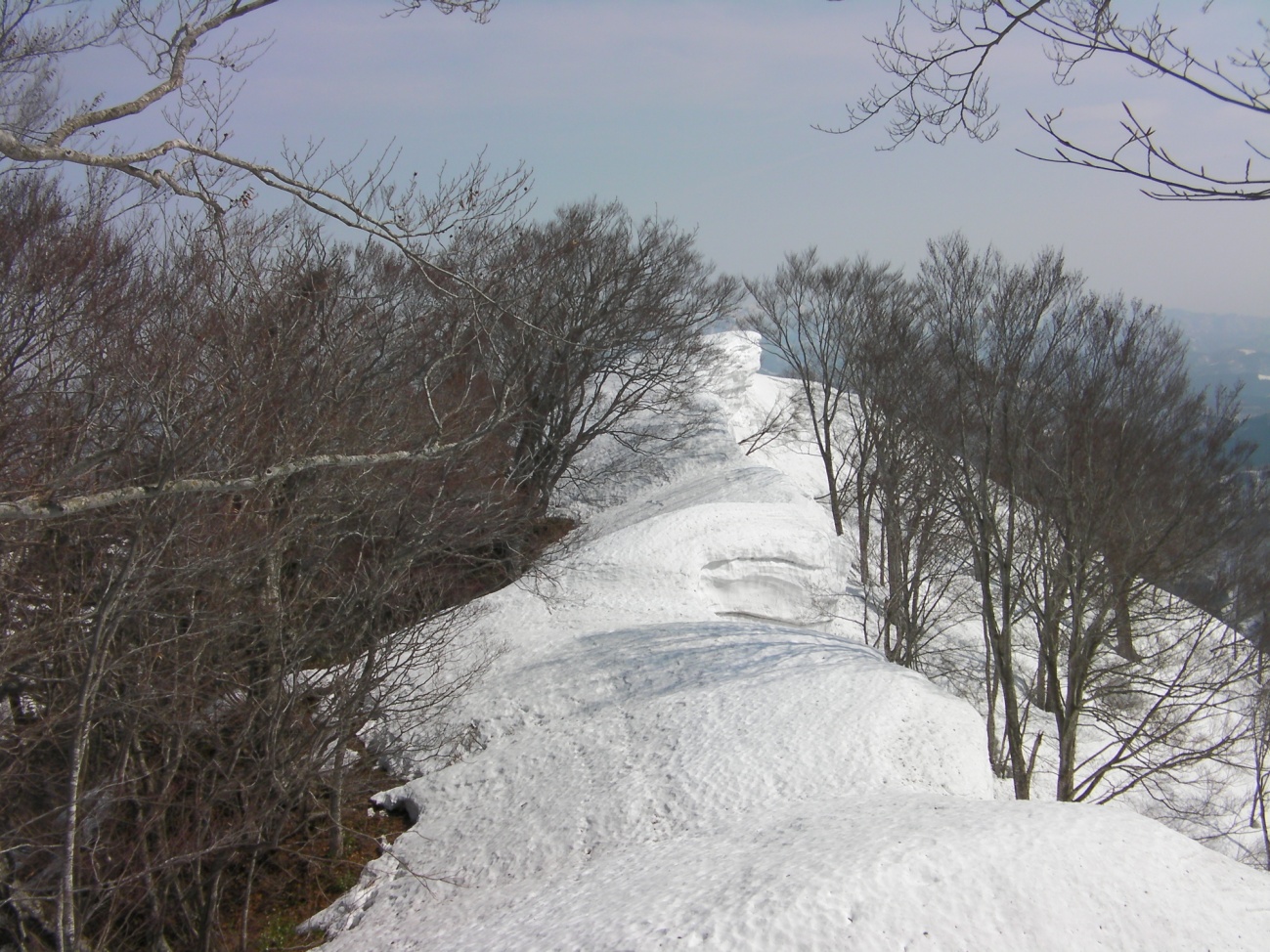 遠目には山頂手前が急に見えたが,そんなところはない.ただ,山頂に近付くにつれて尾根が狭くなってくる.大きくうねって雪庇もできている.