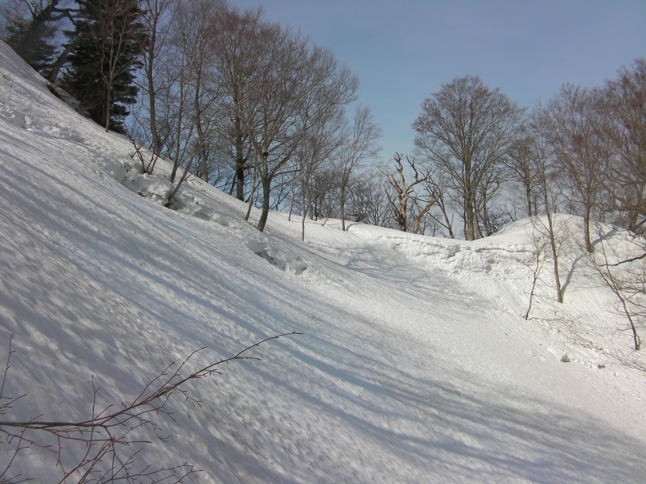 後は,わらび園を滑って降りるだけである.良く滑るざらめ雪に突然ストップ雪が現れ,思わず前方2回転しそうになる.油断はできない.
