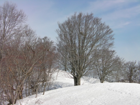 樽口峠から杉林に入ると,落ちた枝や葉で雪面が汚れている.その杉林もすぐに終わり,灌木の開けた尾根となる.先週のトレースであろうか,歩いた跡が続いている.
