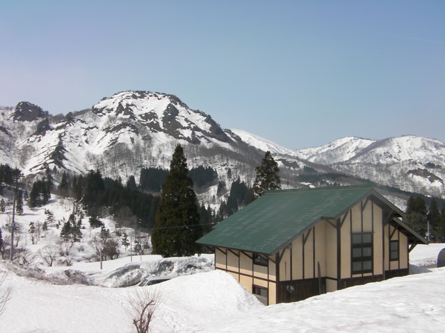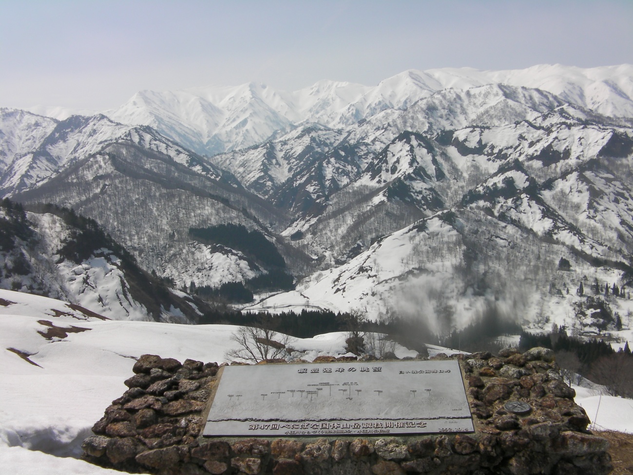 山頂は北側がすとんと切れ落ちていて,あまりなじみのない山形の山々が北から東にかけて広がっている,反対側には真っ白な飯豊の山並みが見晴らせる.素晴らしい展望だ.地図のとおり,三角点が一番高いところではなくて,少し下ったここにある訳である.