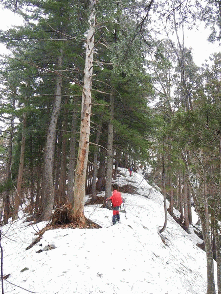 <針葉樹林帯の尾根を登る>