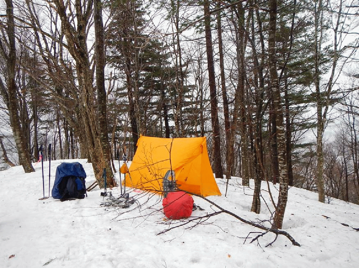 無理すれば山頂まで行けた。しかし、山でのランチタイムも大切な時間で、楽しみのひとつだ。雨脚も強くなってきていたので、ツエルトを張り、大休憩とした。3月も下旬となると、ツエルトの中でガスを点けるとすぐに暖かく(暑く?)なった。