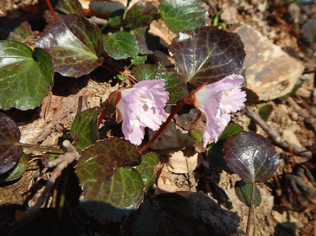 登りではまだ開いていなかったイワウチワの花が下山時には咲き始めている。春の光を浴び、気持ちが良さそうに、あちこちに大きく花を開かせていた。