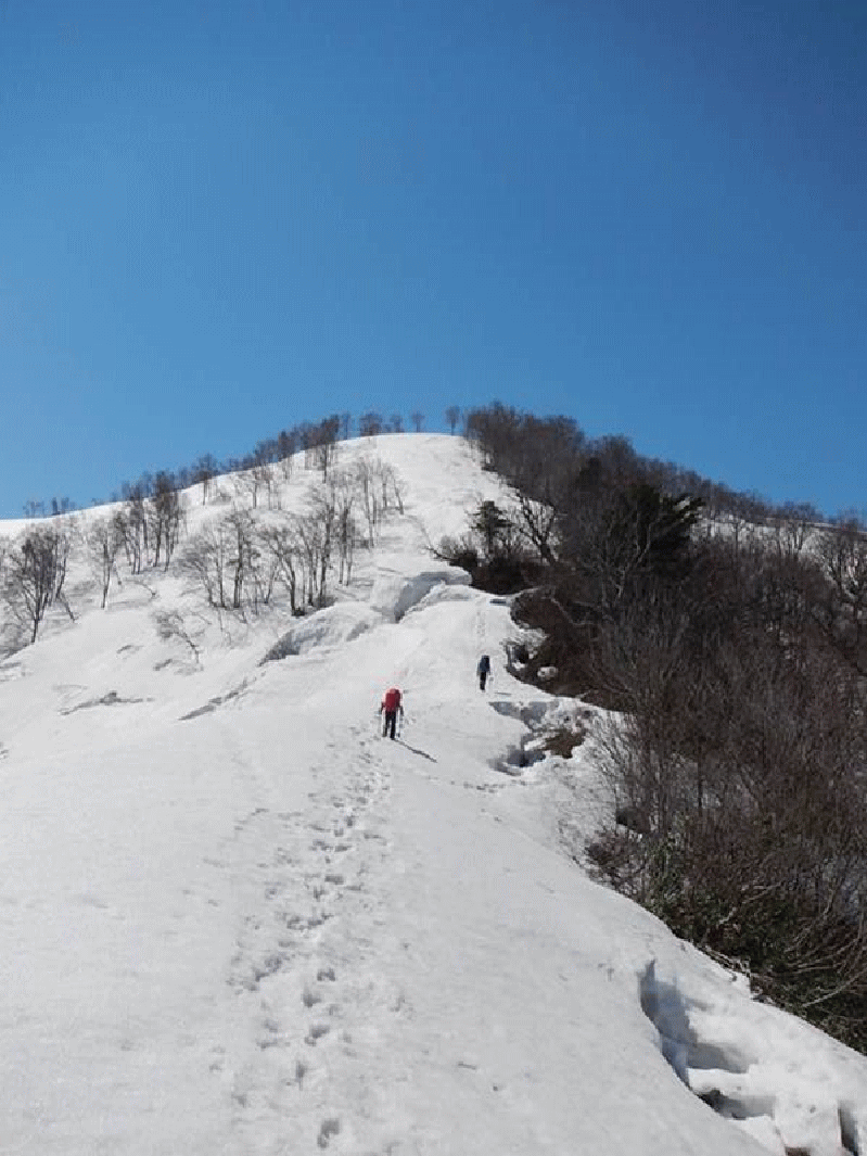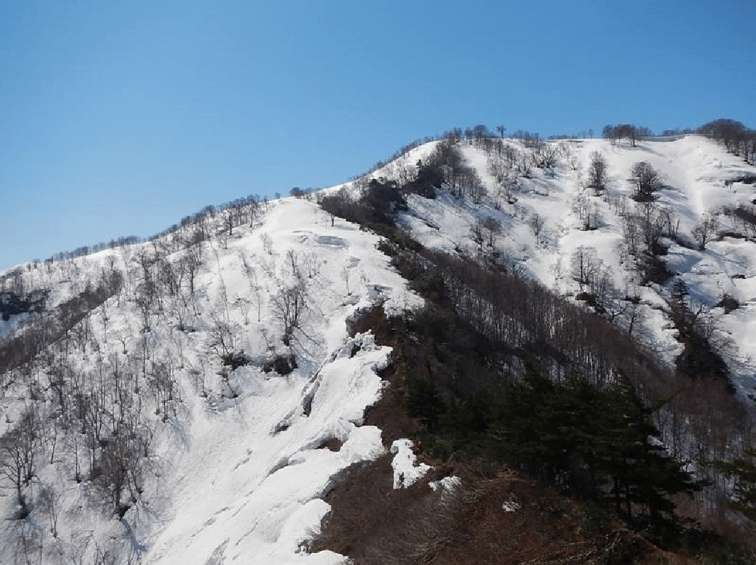 カイラギ荘手前の橋のところに車を止め、まずは車道を行く。大きなデブリを2回ほど越える。登山口の道標は出ていた。顕著な尾根になると夏道沿いとなる。上に行くにしたがって、ブナ林のまったりとした雪斜面となった。