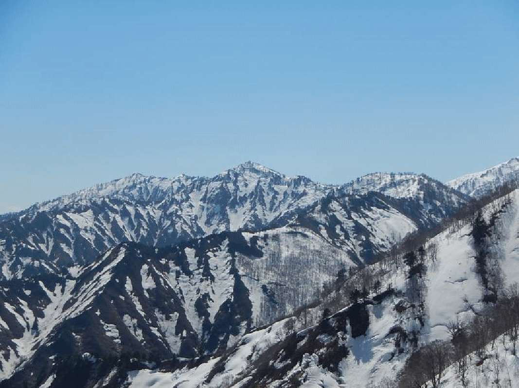 鍋倉山と合ノ峰も望めるようになる。険しい沢を挟む鍋倉山はそびえ立って見える。残雪期にしか登れない山で、今一度登りたいと思っている山だ。