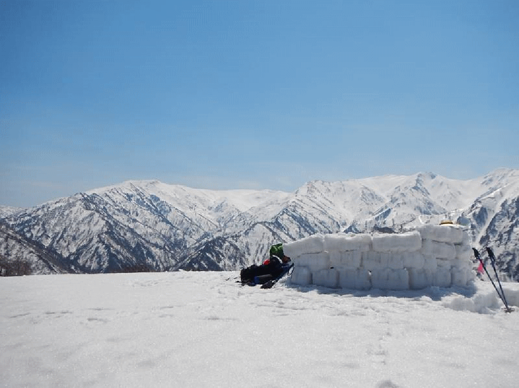 山頂に風除けのブロックを積み、お昼休憩とする。春の日差しは暖かい。青空の中、白く輝く飯豊連峰が連なる素晴らしい光景。そして、自分たちだけの山頂。これ以上ないくらいの贅沢な時間を過ごす。