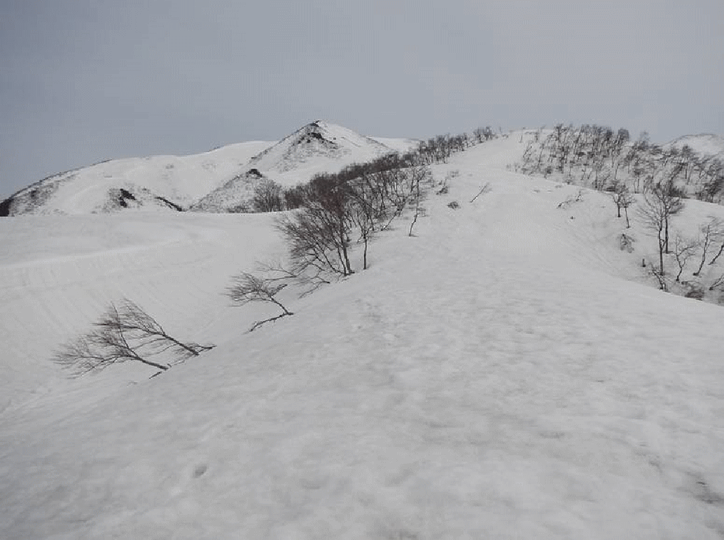 今日4月20日。取り付きの斜面の状況は?斜面は雪なし。どの斜面を登るかで少し時間を使う。でもここは優秀なガイドにまかせる。おっとガイド役は当会の会長であった。荷物が多くないと張り合いのないガイドである。この中尾根ルートに賛同してくれたメンバーは私を入れて4人。ほかに、一王子神社からのルートから2人の参加となった。さて、取り付きながらの斜面は雪がないので枝につかまり長靴のスパイクを効かせながら登る。10分くらいで尾根上の人となる。イワカガミの花盛りである。踏まないように軽い足取りで歩く。ところが、うるさくなり始めた枝が邪魔をする。50分くらい歩いただろうか?ようやく雪の上に出る。570メートル地点る2年前にも休んだ場所だ。まだ覚えているんだなと思った。ここからは雪の上を歩いたり枝のうるさくなり始めた尾根を歩いたりの繰り返しとなる。高知山の姿を右手に見ながら歩く。3−4回の休憩後1270メートル上を目指す。ここからはクレパスが数箇所現れてくる。この上で一王子からのルートが左手に現れ、人も見えてくる。7時40分に急斜面に取り付いてから12時10分に見覚えのあるオレンジ色の小屋に着く。お昼は約2時間。2時に下山開始。若い2人を残し下山。そして誰もいなくなる一歩手前での行動となった。