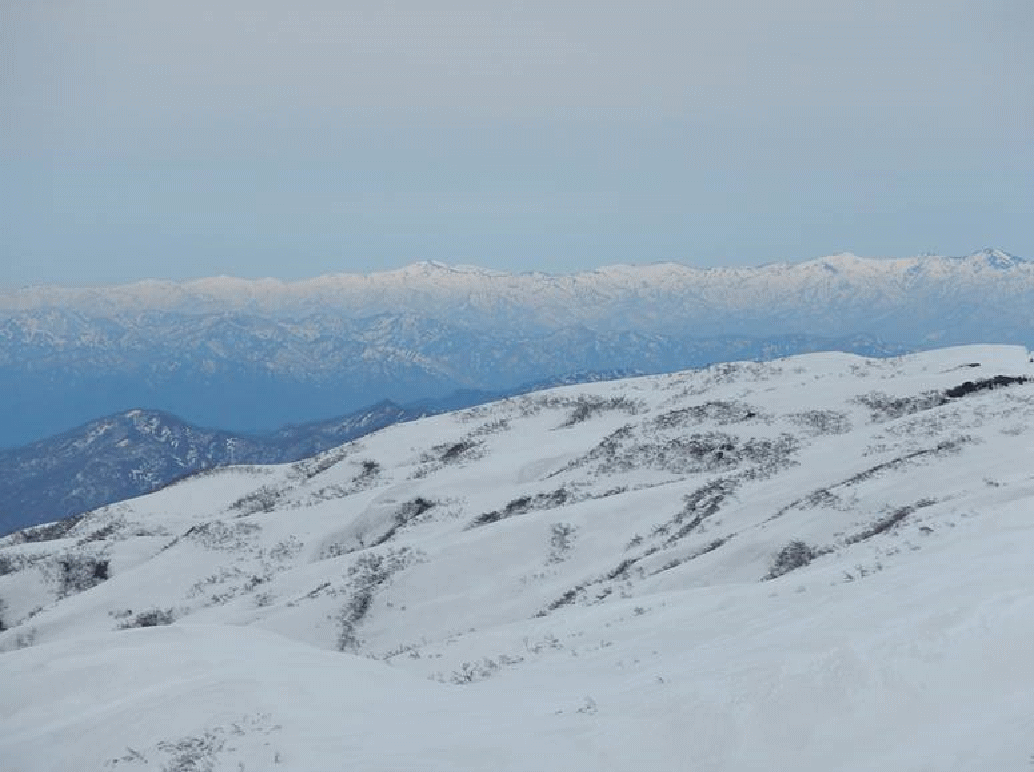 「遠景は朝日連峰」