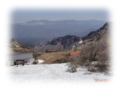 ここまで雪はほとんどなかったが、登山道は最初から残雪の上を歩く。晴れた空、樹間越に見える磐梯山が絶景だ。とても気持ちの良い登山となった。登山道が出ていないので夏道を少し外れているのか中の湯跡は左に見る格好で登っていく。途中、道が違うと言っている人もいたが、残雪で道が隠れているので登りやすいところを登るだけである。大勢の人の足跡があるので迷うこともない。2月に悪戦苦闘の末撤退した磐梯山も、今日のような好条件だとさくさくと順調に登っていける。弘法清水では裏磐梯方面の景色がすばらしい。大きな雪面を山頂に向かう。上からはシリセードで楽しむ人もいた。少々辛い登りをがまんし、ほどなく山頂に到着する。独立峰であるため広々とした空間が広がる。猪苗代湖と南会津、那須連山、反対側には檜原湖などの裏磐梯の湖、吾妻連峰、飯豊、朝日連峰、安達太良山と枚挙にいとまがない。