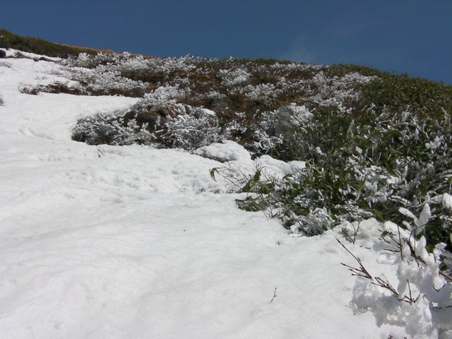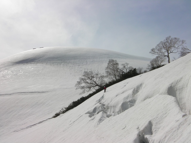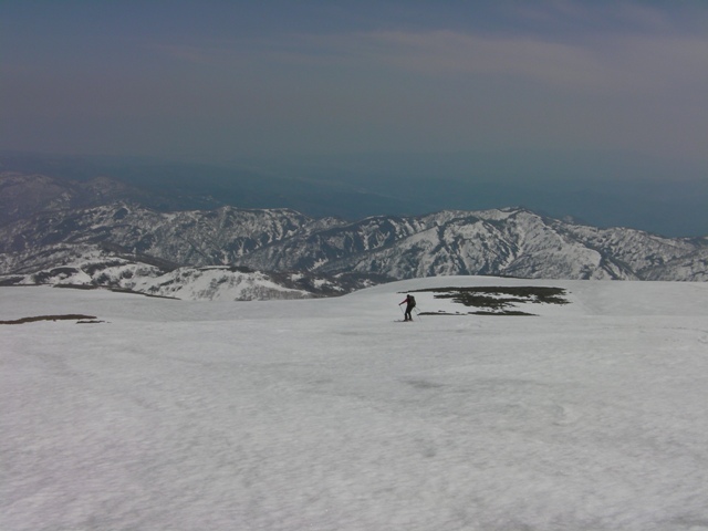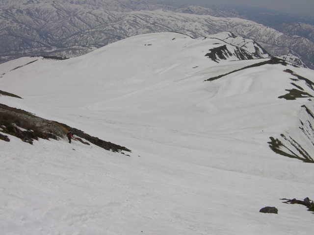 山頂でスキーをザックに付け,昨日板を外したところまでつぼ足で下る.さすがにまだ登ってくる人とは出会わないが,牛首付近に1名見える.