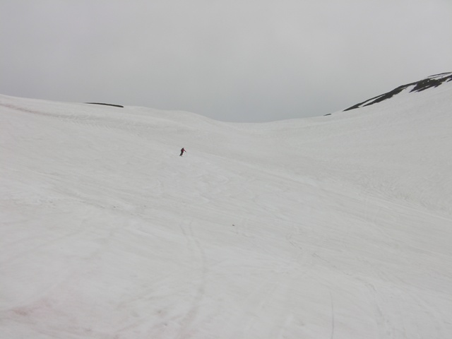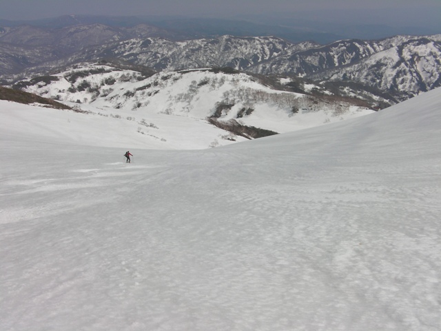 牛首を過ぎるとようやく雪も緩み,スキーのトレースだけとなって快適に滑りを楽しめるようになる.登山者を右上に見ながら夏道付近を滑る.