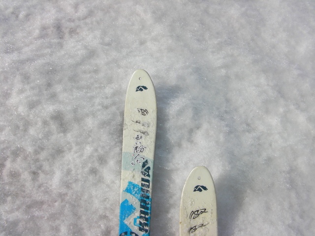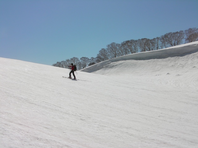 白い大雪面が広がっていて気が付かないが,見た目よりも角度があるのである.それでも少し滑ると,なんちゃってテレマークでもそれなりに楽しく滑られるようになる.これまでで,一番滑りやすい雪である.