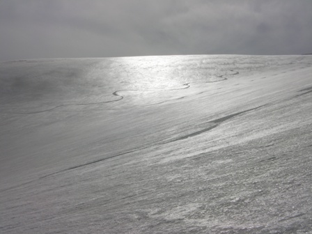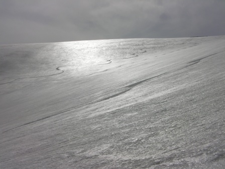 標高1610m付近を概ね北側にトラバースし,本日滑ったトレースを越したところから小屋に向かって違う尾根を滑る.パリパリのフィルムクラストの雪面を滑る.最高である.斜面が夕方の斜光に照らされて銀色に光り輝いている.