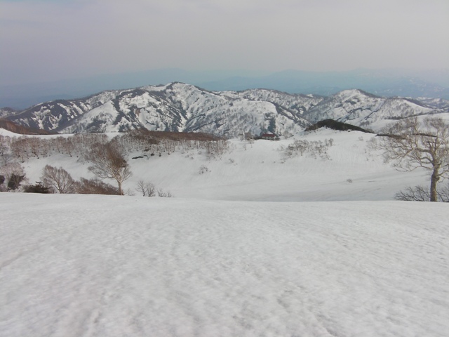 月山スキー場のリフト上には行かず,その下の斜面を延々とトラバースする.腿にくるところである.