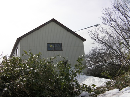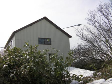 小屋向かいの斜面には大きなシュルントができている.それをかわして滑り下りると小屋の下である.