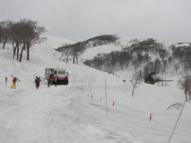 姥沢からは月山スキー場まで雪上車でスキーだけを無料で運んでくれる.無料であればもちろんのことお願いをするメンバー二人である.