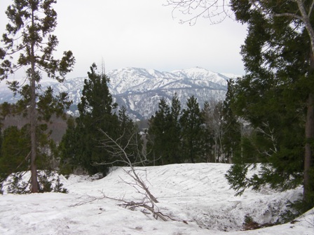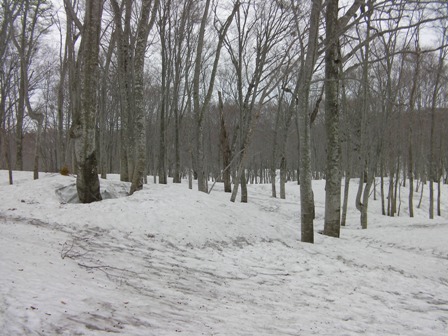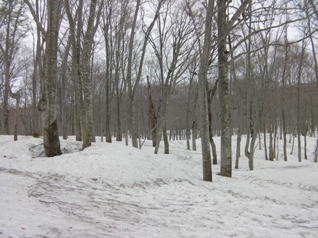ここまではずーっとオープンスロープであるが,ここからは林間スキーが始まる.ただし,ゲレンデ斜面のようになっていて少々興ざめではあるが,変化があって意外に楽しい.