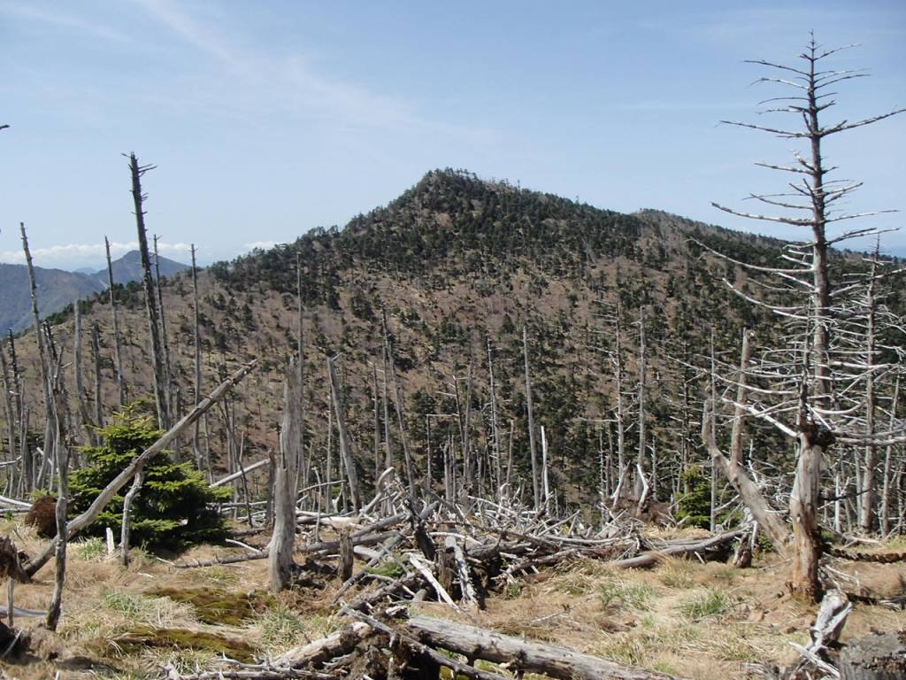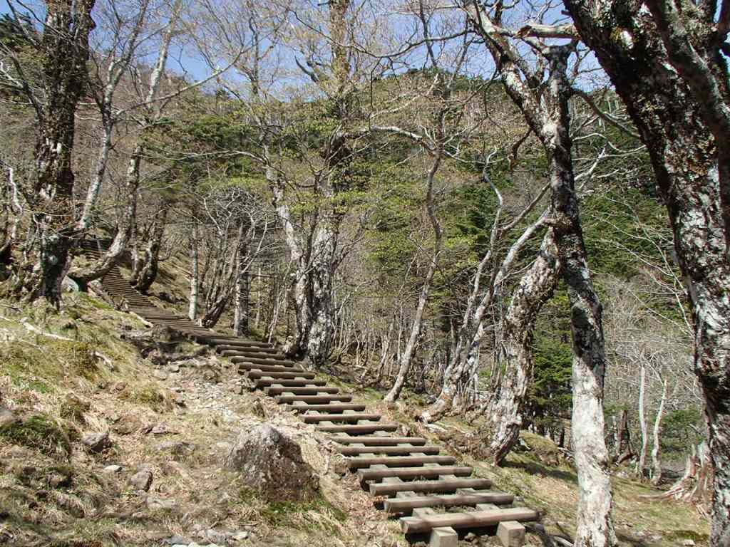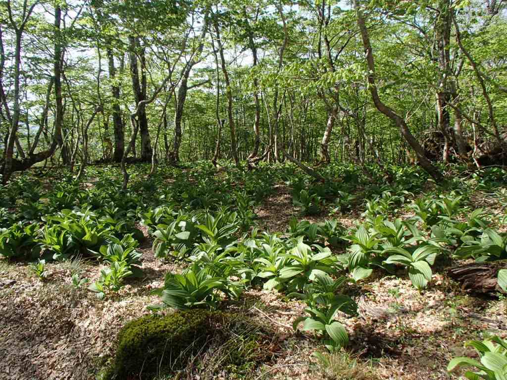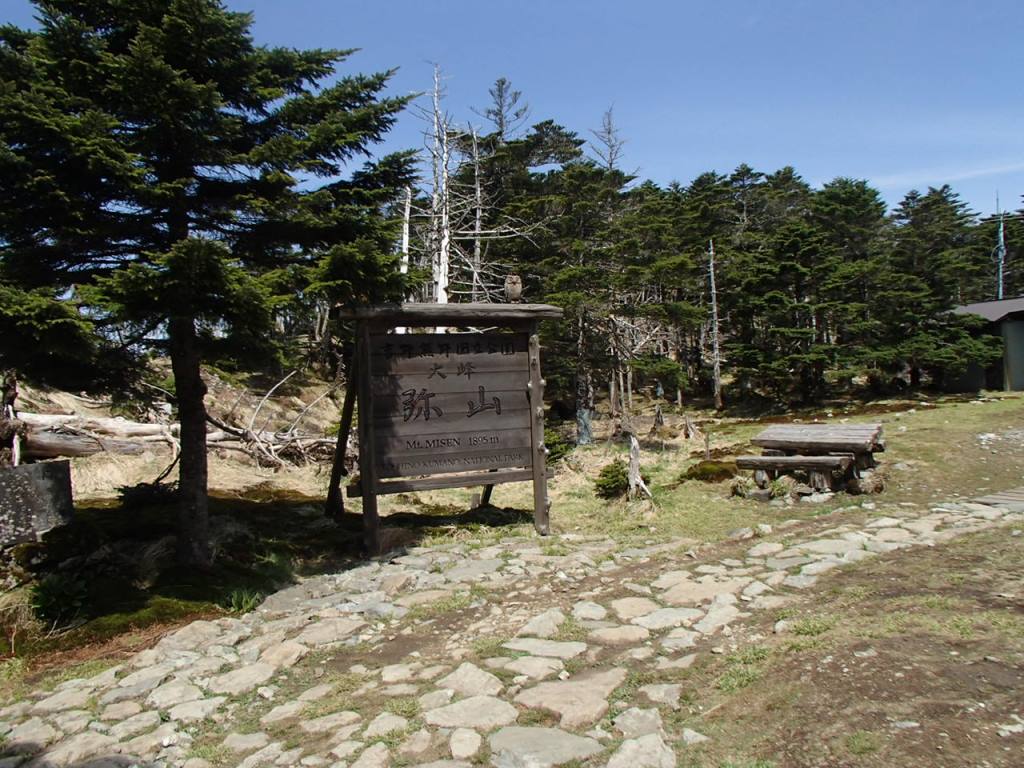 わぁ〜! 」と感動の言葉が出てしまう。これがかなり続くので急登の苦しさも忘れてしまう。1時間程で奥駈道出合となり休憩とする。ここで朝のエネルギー補給をした。やや平坦な登山道となる。新緑がとてもきれいで、今度はまだ花は咲いていないがコバイケイソウがところどころ大群落を成している。ほんとうにきれいな登山道だ。大峰奥駈道といって行者の修行の道となっているが、癒しの道である。弁天の森というピークを過ぎると緩く下って行く。前方に弥山の小屋が見えるが、どんどん高くなっていく。すれ違った若い男の人に聞くと、弥山の手前が急登で特に苦しいとのこと。不安になってきた。下りきると当然であるが登り返しである。立派な階段のある登山道をあえぎながら登りきると、ひょいと弥山小屋に到着した。神社があるのでお参りした後、しばし休憩する。森林と枯れ木の特徴ある姿の八経ケ岳は目の前にあった。弥山から約30分程で八経ケ岳山頂に着いた。新潟からここまで到着できたことが感銘である。いったい何キロの道のりだったのだろうと西遊記で天竺に到着したような感慨にふけった。それにしても紀伊の山は奥深い。幾重にも山並みが繋がっており、山の名前も地名も方向も全く解らない。