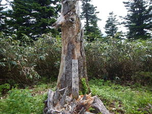 ピークから栂峰山頂まではまた針葉樹林帯(=アオモリトドマツ)となる。緩やかな起伏で、栂峰山頂に着いた。あれれ、どうも以前来たときと様相が違う。