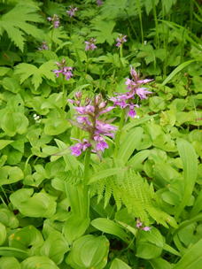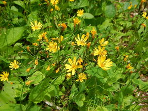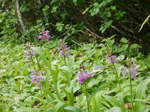 最初は針葉樹林を行くが、尾根道になると、ブナ林に変わる。美しいブナ林が広がる中急斜面で登りやすい道が続く。蔵王神社があるピークの小さな草原にはハクサンチドリやマイヅルソウが咲いていた。