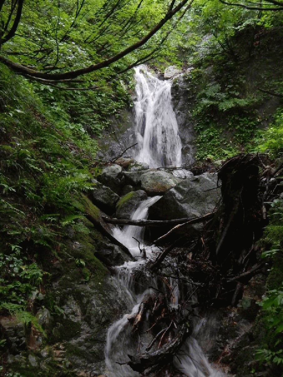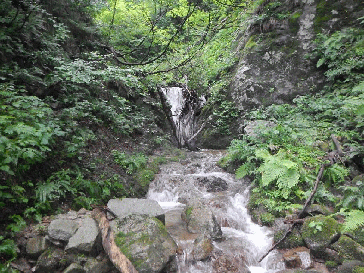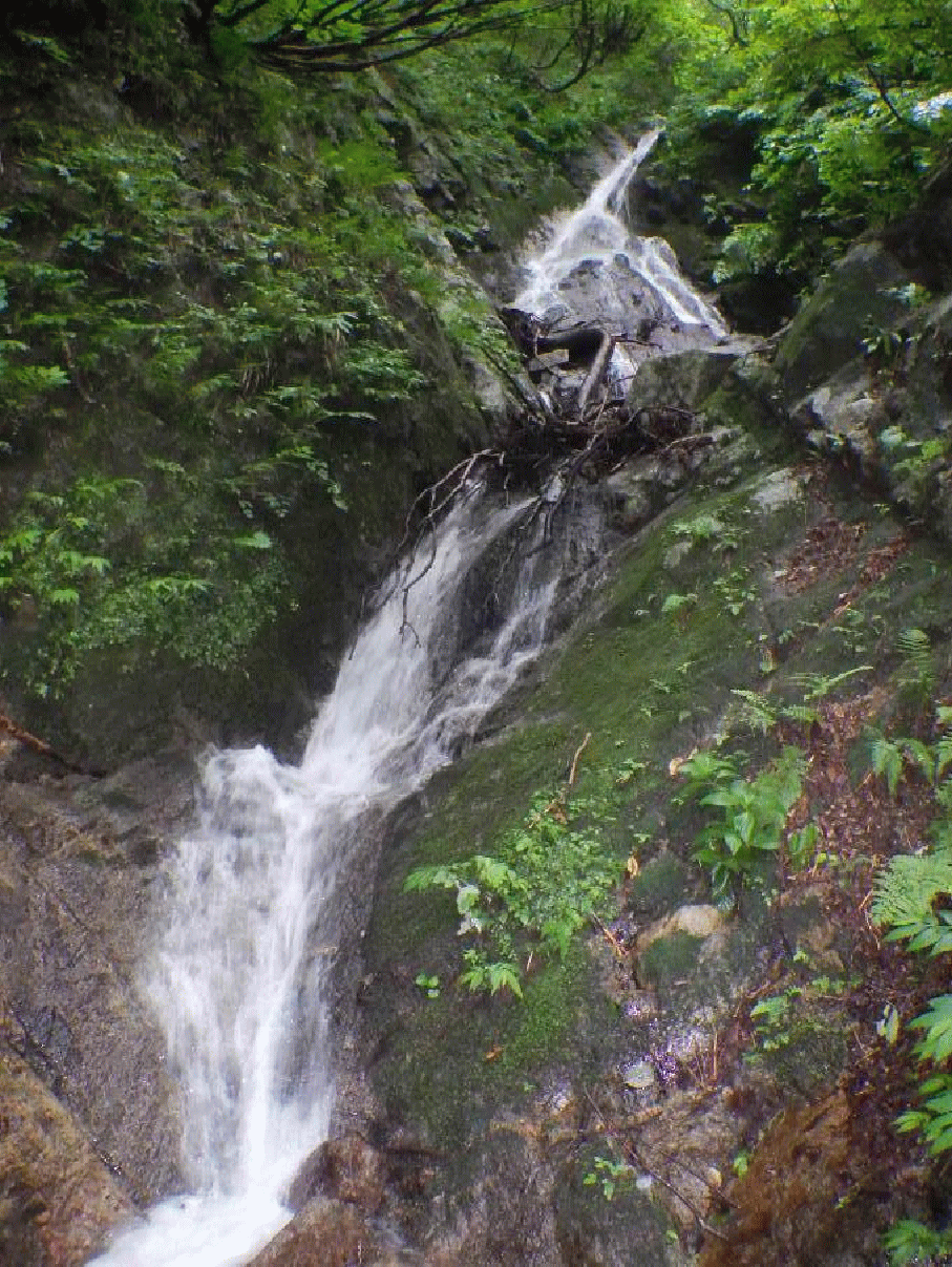 遡行を開始するが、やや水量も多い為か、頭から何度も水を浴びる。登れない滝もいくつかあり、何度か会長からロープを垂らしてもらう。以前はもっと易しいイメージがあったが、登摩力が衰えた為か、結構厳しい。詰めの最後の2段の滝は取りつくことができず、手前の枝沢を稜線に向かって木に捕まりながら登る。両手両足を使った登りと藪漕ぎで疲労がピークに達した頃、ようやく稜線の790m地点の登山道に出た。