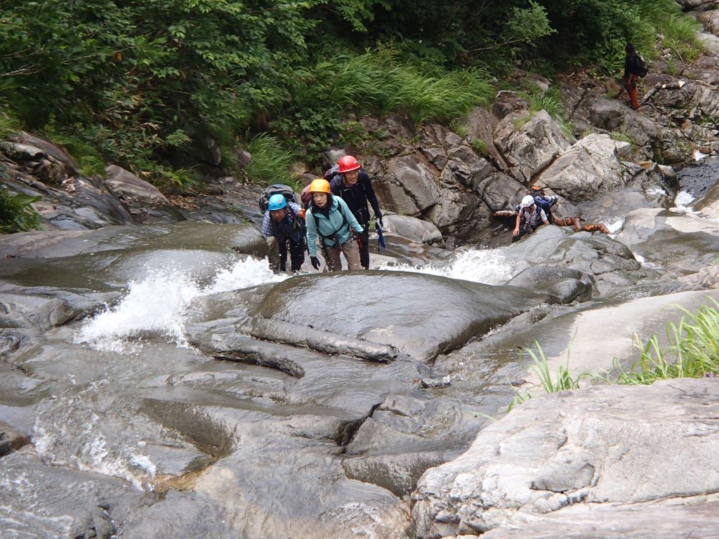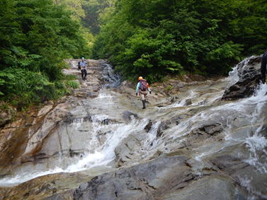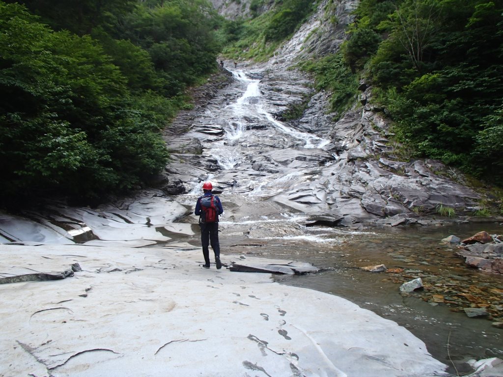 専修の五頭の沢に比べると沢のスケールも大きく、岩盤と水の景色がとても綺麗だ。30分程でハナゲの滝、長大な滝であるが、傾斜が緩い上に今日は水量も少ないので、問題なく登れる。