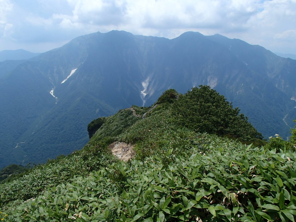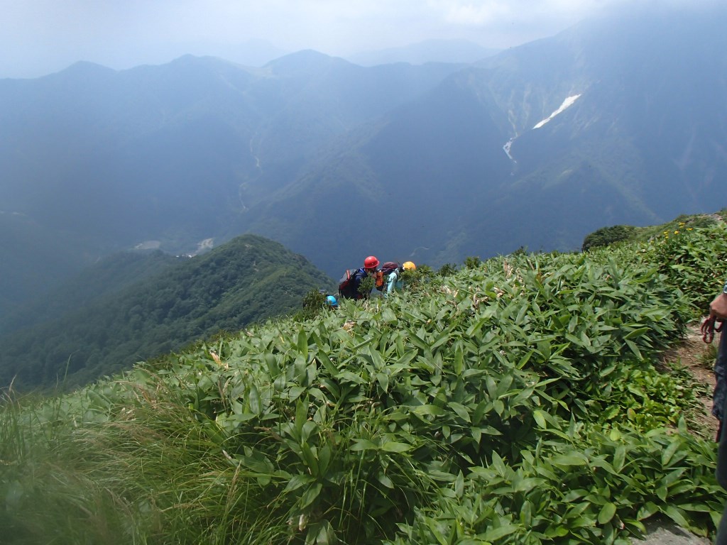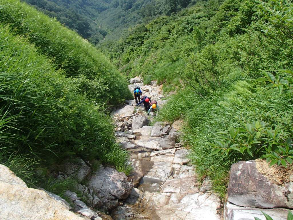 その後約2時間半、沢を詰め、ゴーロとスラブ、草付を登って行く。山頂に近づくにつれ急坂になり苦しい。ひたすら忍の精神で登っていく。ふと振り返ると、別のパーティが上がってくる。やはり明るく綺麗な沢は人気だと思った。