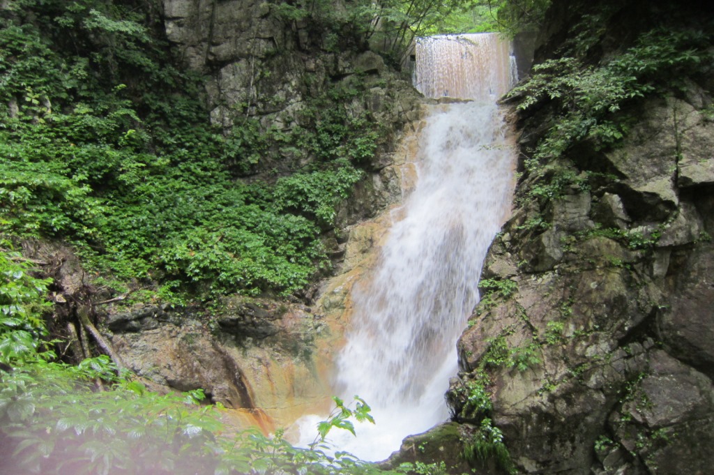 那須連峰で気になっていた沢として阿武隈川支流の白水沢がある。渓相がきれいで、関東の人達にも人気の沢らしい。登山道の尾根を挟んだ反対側の南沢は等間隔に滝をかける登攀的な沢だったが、白水沢はそれよりは1グレード易しいらしいとの情報の中で突入する。しかし結果はどうしてなかなか、登りがいのある滝が多く、結構な苦労を強いられた。4時30分に新潟を出発、7時15分頃には甲子温泉大黒屋前に到着、沢支度をして出発する。我々の後に車がもう一台到着し、沢登りの準備をしていた。大黒屋の前を歩いて堰堤を渡り甲子山登山道に入り分岐を白水の滝へ進み、入渓する。