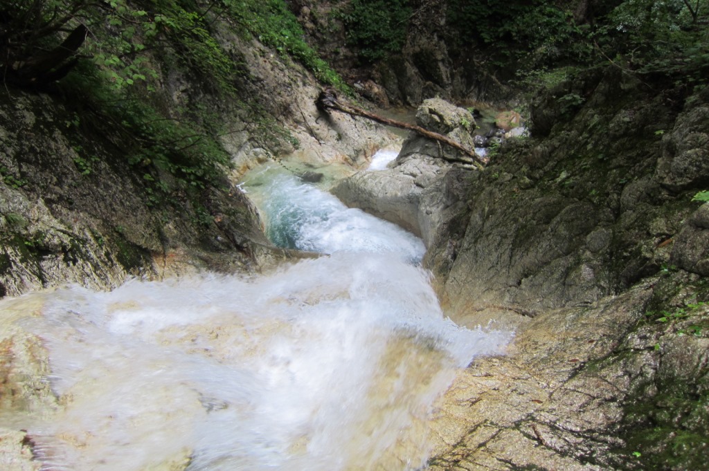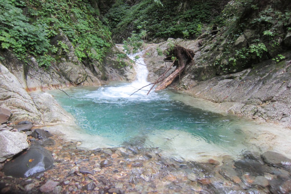 沢はコンパクトであるが、白く磨かれた床と青い釜を併せ持ち非常にきれいだ。倒木が少し邪魔で、ところどころ景観を損ねている部分はあるが、概ね良い印象である。