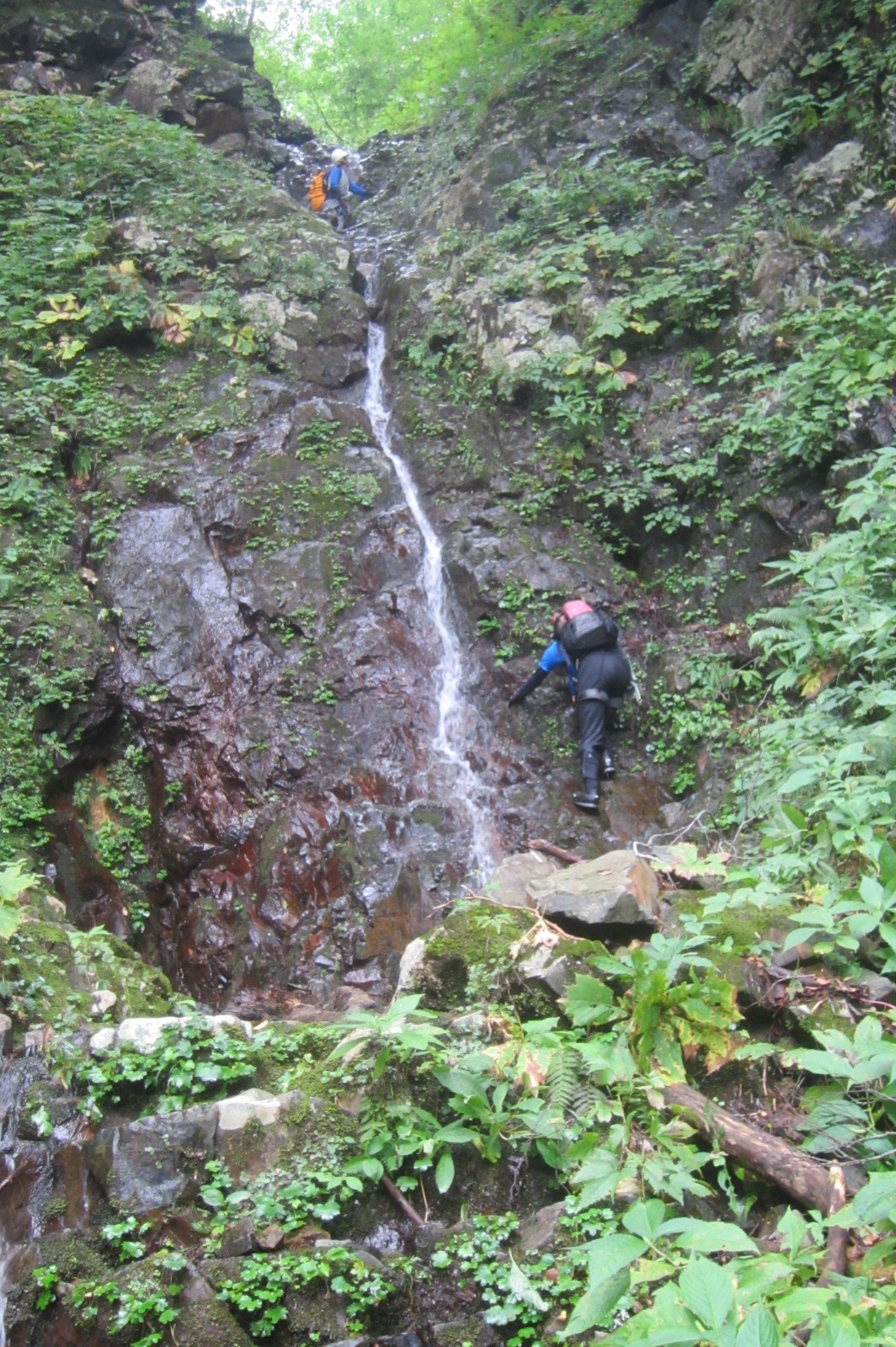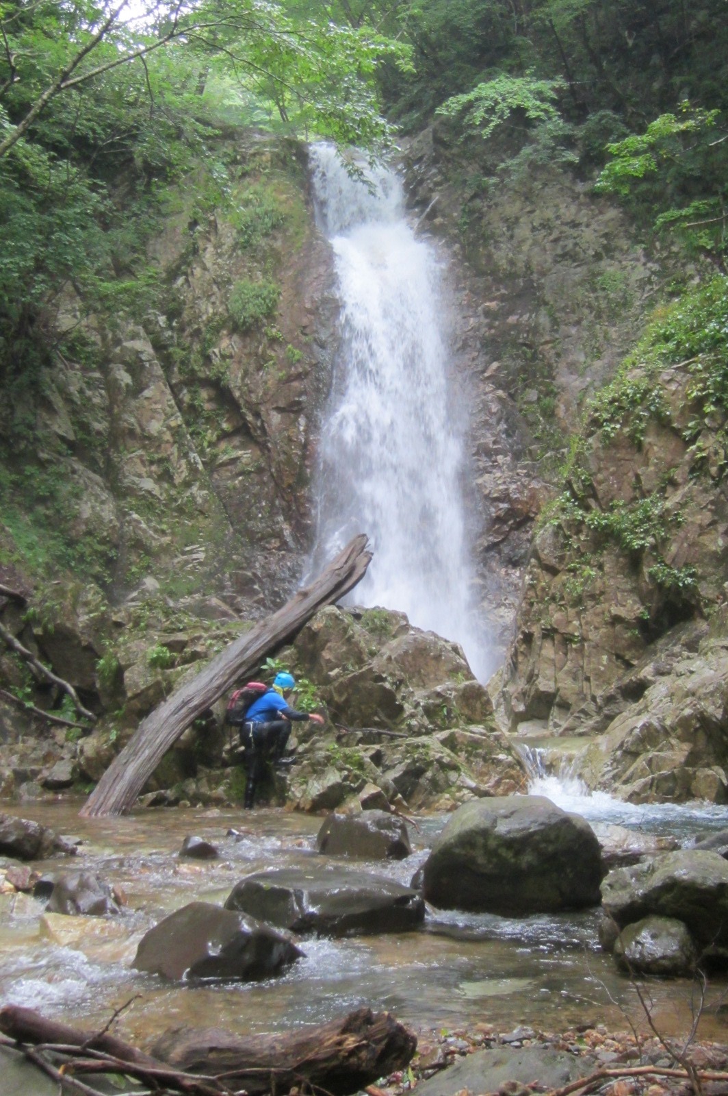 続いて少し難しい8m、6mの滝を超えたところで、後続の5人パーティ(女性2人、男性3人)に抜かれる。我々が苦労した滝も、全員が手間取ることなく超えている。結構沢慣れたパーティのようだ。しばらくして先程のパーティが少し先の二俣で休憩していて、我々は右俣の方へ入ったがこれが間違い。少し行って気づいて戻ったが、休憩していた人達はもういなく、その後、追いつくことはなかった。