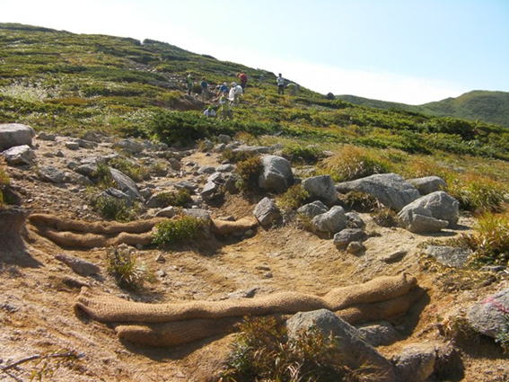 土嚢にヤシ繊維と土を混ぜて要所に置いたり,ヤシネットにヤシ繊維と土を混ぜたあんこ巻いてヤシロールを作ったりする.土を詰めた土嚢を運ぶのは大変であるが,以東岳など周辺の山を眺めたり,さわやかな風に吹かれながらの作業は思いのほか気分が良いのであるが,そんな気分で適当にやっている本日副班長の作業場所はたいていやり直しとなる.いつものことながら,とほほである.