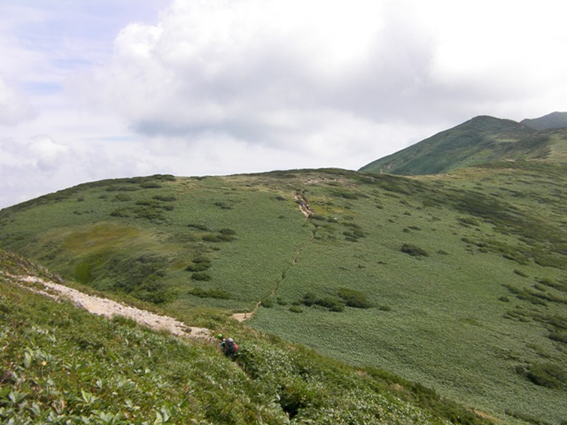 三角峰の南側を巻いて,水場鞍部に至る.この上の標高1480mくらいからオツボ峰下部の標高1600mまでの間の風衝地帯にできたガレ地を4班に分かれて保全作業をする.
