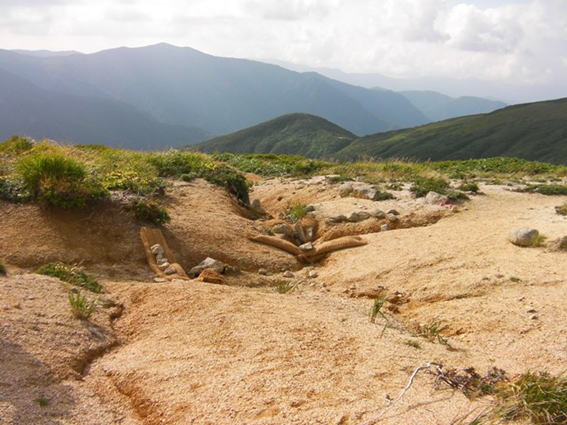 この場所では初めての保全作業のため,今回の主な目的は水の勢いを殺して,土を落ち着かせるところにある.もともと風衝地帯は風が強く,構造土となっているところである.そこに登山道が付けられているのでガレ場が広がりやすいのである,きっと.